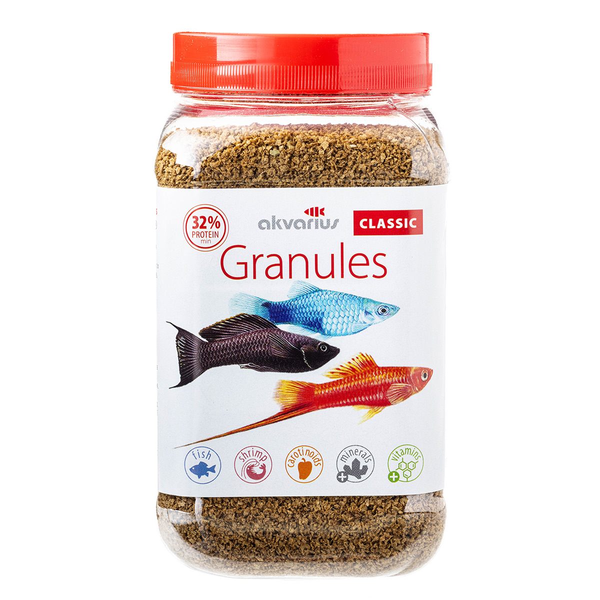 Один з наших найперших та найпоширеніших кормів. Зручний, економічний та придатний для годування більшості дрібних та багатьох середніх риб в усіх шарах води - спочатку він деякий час тримається на поверхні і його поїдають пецилії, меченосці, гупі, дермогеніси та інші риби, що харчуються на поверхні. Потім він повільно тоне і ним ласують рибки, які харчуються в середніх шарах води - барбуси, тернеції, неони, тетри та багато інших риб. Нарешті, гранулами, які досягли дна, ласують донні рибки: соми-коридораси, молоді лабео, боції, аканофтальмуси тощо, а також креветки і водні равлики.