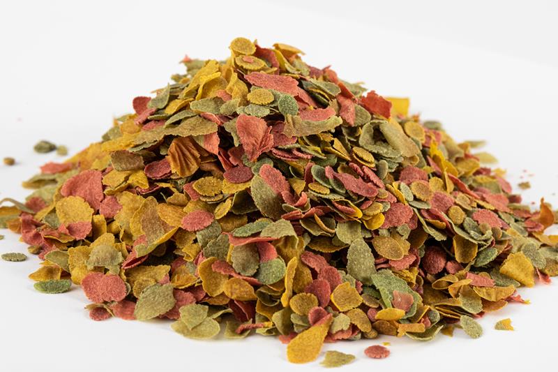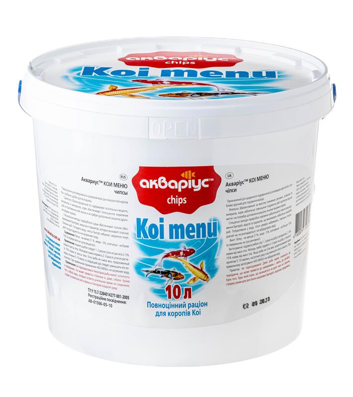 Щоденне меню для молоді коропів Коі та інших декоративних ставкових риб. Корм у вигляді чіпсів, що деякий час плавають на поверхні води, а потім повільно тонуть.