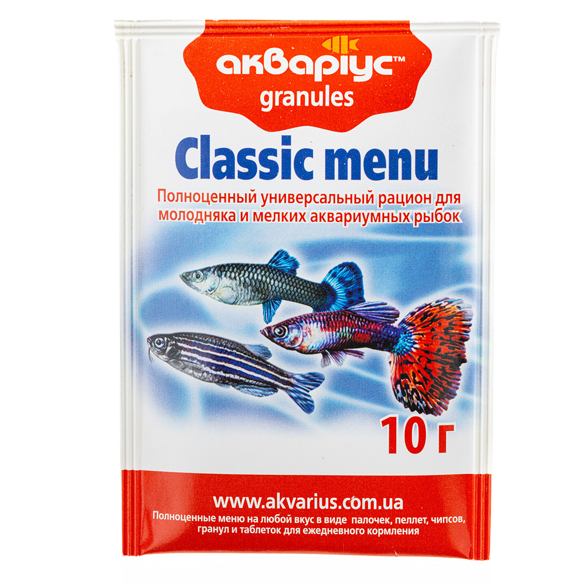 Класичне меню, гранули. Універсальний збалансований раціон для щоденного годування дрібних та середніх видів акваріумних риб, що беруть корм в усіх шарах води: пецилій, мечоносців, тернецій, барбусів, лабео, боцій, сомиків, а також молоді. Містить всі необхідні поживні речовини та вітаміни для здорової життєдіяльності. Не потребує доповнення іншими кормами.