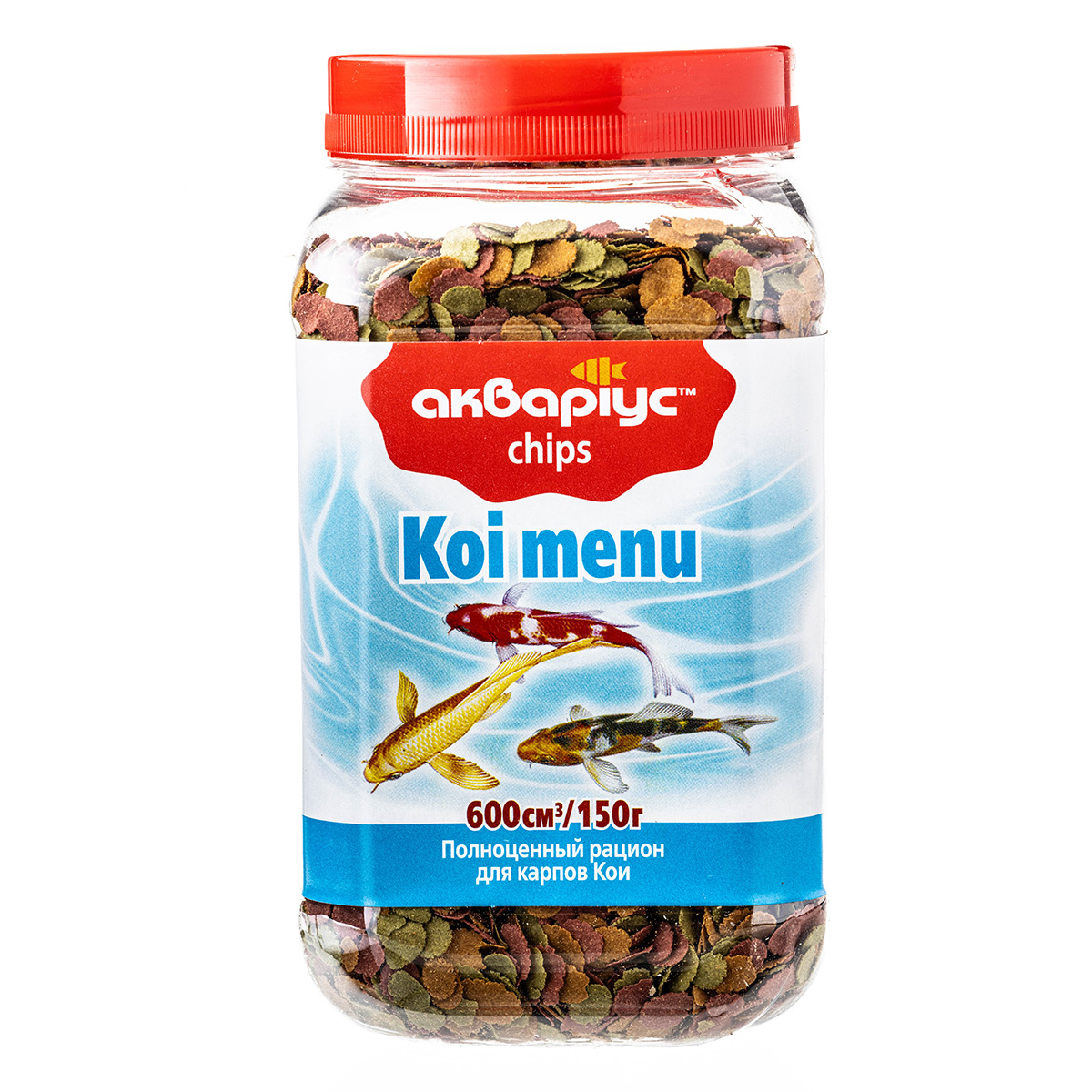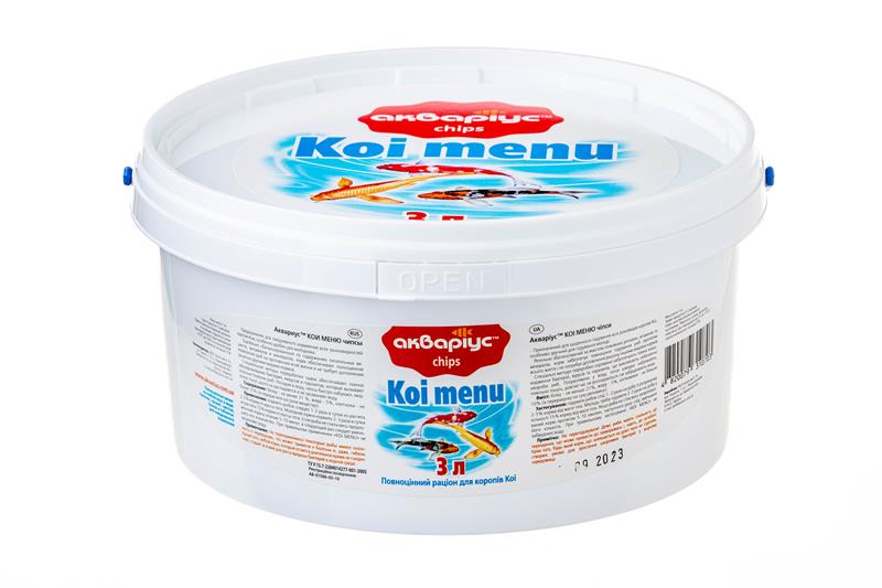 Щоденне меню для молоді коропів Коі та інших декоративних ставкових риб. Корм у вигляді чіпсів, що деякий час плавають на поверхні води, а потім повільно тонуть.